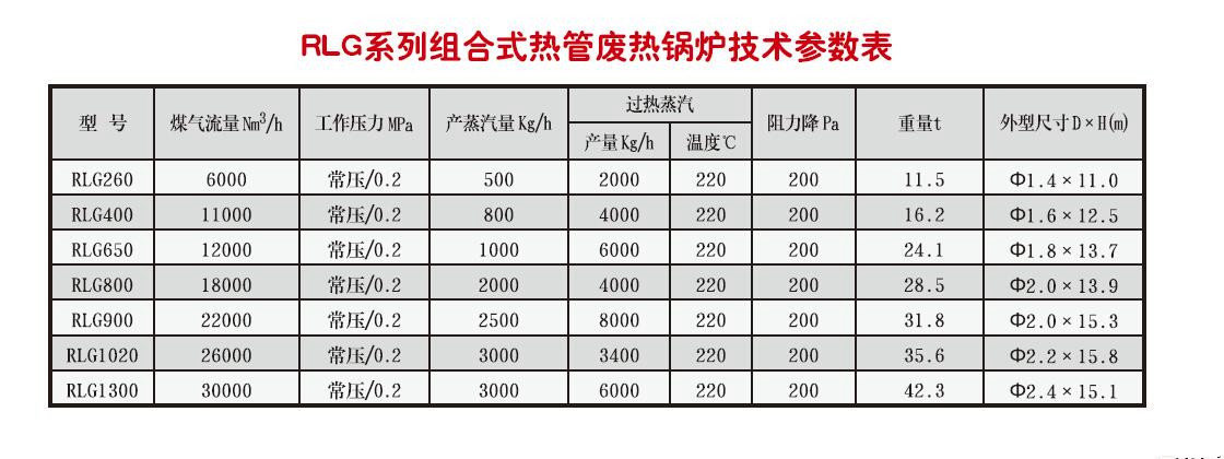 RLG型組合式熱管廢熱鍋爐是用于氮肥行業制氣工段的設備。利用上下行煤氣顯熱,將120°C飽和蒸加熱到220C,提高了入爐蒸汽溫度和蒸汽分解率,大大提.高了半水煤氣的質量和產量,從而達到節能降耗的效果。
