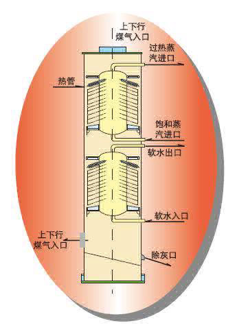 由蒸汽過熱器和水加熱器組成,利用上、下行煤氣顯熱過熱蒸汽并加熱軟水產蒸汽,1噸合成氫可將800kg(或2200kg) 120C蒸氣加熱到220°C,且產生270kg(185kg)飽和蒸汽。這樣提高了入爐蒸汽溫度,確保蒸汽分解率,提高了煤氣氣質。