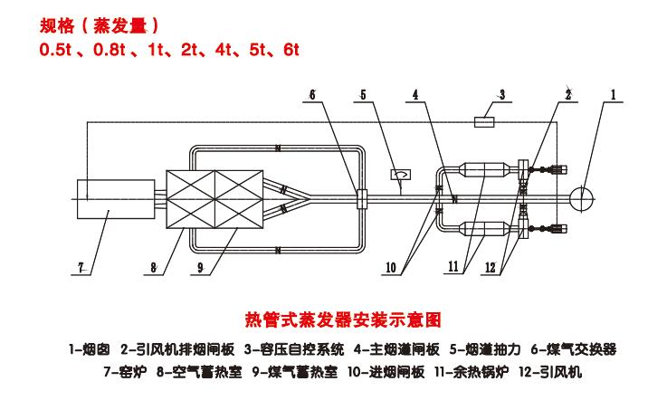 工作原理熱管式蒸發器主要是由汽包、熱管和煙箱組成。該設備主要安裝在熱室后的煙道上,運行時窯爐產生的廢煙氣從設備煙箱中通過,煙箱中的熱吸收煙中的余熱傳導給汽包中的水,使水受熱汽化,產生飽和蒸氣供生產和生活使用,從而替代了原有的蒸汽鍋爐,達到節能降耗的作用。
